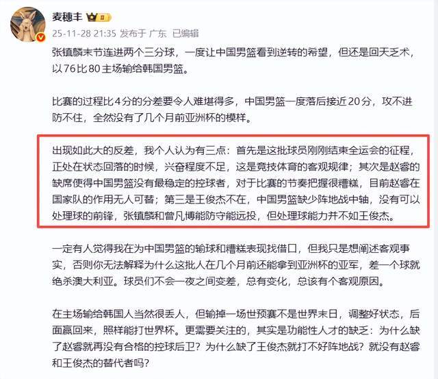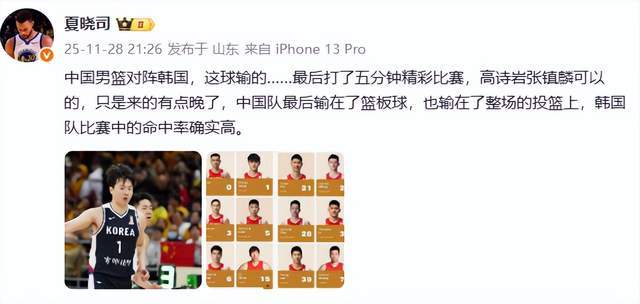 山东媒体人夏晓司老师也给出了自己的观点,在他看来,“中国男篮对阵韩国,这球输的……最后打了五分钟精彩比赛,高诗岩张镇麟可以的,只是来的有点晚了,中国队最后输在了篮板球,也输在了整场的投篮上,韩国队比赛中的命中率确实高。