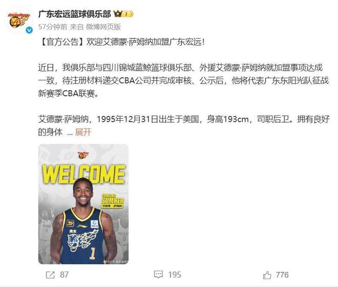 广东队官宣萨姆纳加盟,总花费超2500万,新赛季志在夺冠
