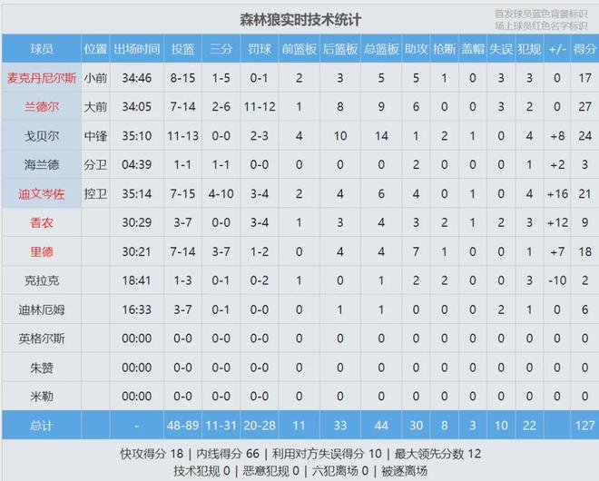 迪温琴佐大心脏表演,末节最后2分钟命中两记三分,27.4秒这记三分直接杀死勇士。全场结束,森林狼127-120战胜勇士。森林狼三人20+:兰德尔27分9板6助、戈贝尔24分14板2断、迪温岑佐21分6板4助;库里空砍39分5板5助。
